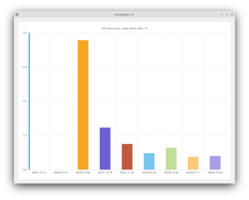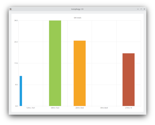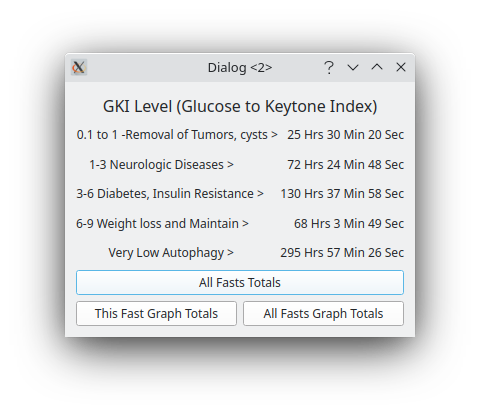 Also, on this form, the second button, 'All Fast Graph Totals' will open a graph that will show, in bar chart form, the actual hours spent on all your fasts, that is, the total hours spend on all autophagy(GKI) levels.