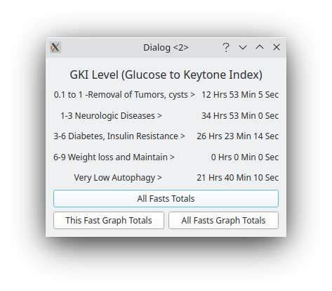 On this form, there are two buttons, the first 'This Fasts Graph Totals' will open a graph that will show, in bar chart form, the actual hours spent at this one fast, the total hours spend at each autophagy(GKI) level.